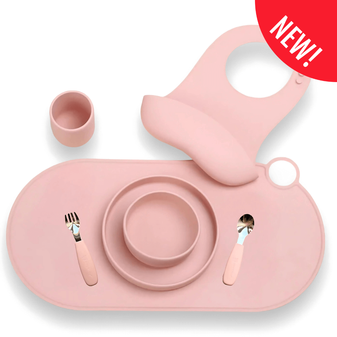 The Teeny Weany Silicone Weaning Set is the perfect companion for toddlers transitioning to self-feeding. This 7-piece set includes everything you need for a seamless mealtime experience. It features a non-slip silicone bowl, an undivided non-slip silicone plate, a silicone cup, a stainless steel cutlery set with silicone handles, a silicone bib with a food-catching pocket, and a non-slip silicone placemat—all in a stylish pink color.